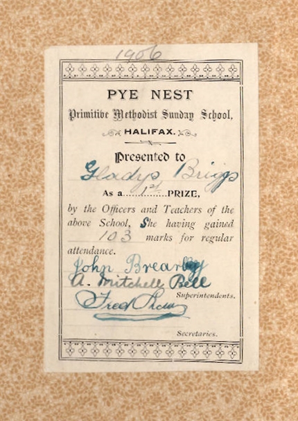 The label is for a prize for regular attendance given by the Primitive Methodist Sunday School at Pye Nest, Halifax to Gladys Briggs in 1906. The label is signed by two superintendents, John Brearley and A. Mitchell Bell, and by the secretary, Fred Lacey. This is a wealth of information that can help us to work out where and when the book was awarded. As in the previous examples, I am showing the process which I use for this sort of investigation.