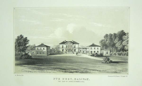 The name Pye Nest supposedly originated from magpies roosting in a small wood on the site, and there is a large park to the west still called Crow Wood Park. The name Pye Nest was given to a famous country house built on the site in 1767 for the Edwards family by the noted York architect John Carr. The last member of the Edwards family died in 1932 and the house was demolished in 1935. Fortunately, there is an impressive engraving of the house published in 1855.