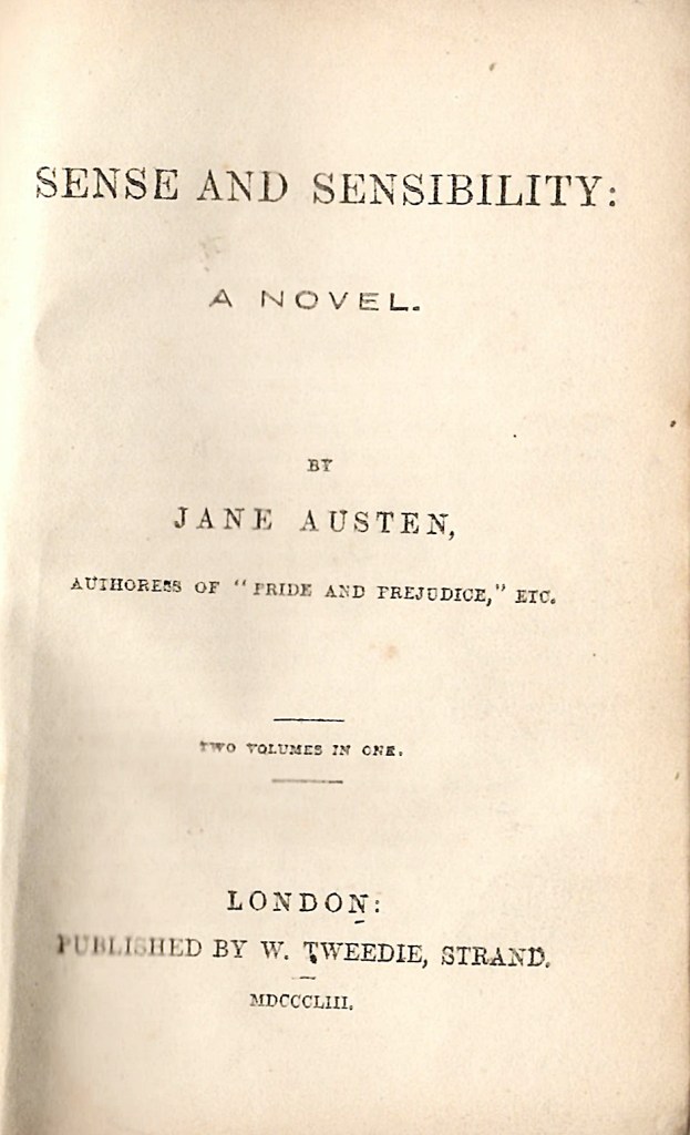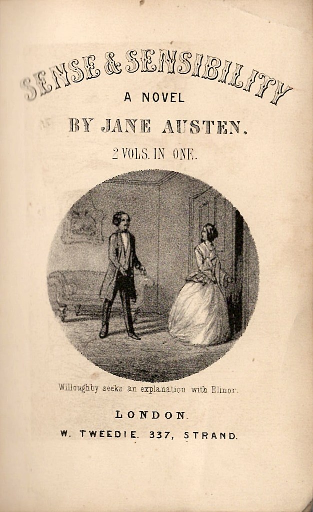 In this post, I am exploring the source and provenance of an early edition of Jane Austen’s Sense and Sensibility that I acquired a few years ago. It was published in London by W. Tweedie at 337, Strand and does not appear to be listed in any Austen bibliography. There is also no copy found on Worldcat.org. It is an interesting little book, 130 x 90 mm (5 3/8″ x 3 1/2″), whose engraved title page and frontispiece are shown below.