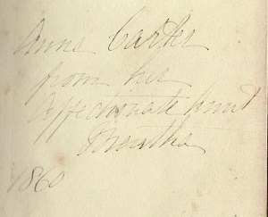 My Tweedie Sense and Sensibility does have an inscription on the free front end-paper. It reads “Anne Carter, from her affectionate Aunt Martha, 1860.” It is shown in Figure 7 below.