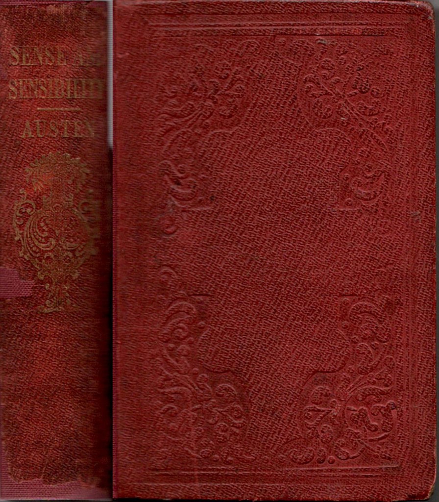 My copy of the Tweedie edition of Sense and Sensibility is bound in what appears to be its original blind-stamped red cloth binding with a rather faded gilt title and decoration on the spine, which has been re-backed. The title reads “Sense and | Sensibility |________ | Austen” with an ornamental urn below as decoration. All three edges of the pages have been gilded. The binding, which still has what seem to be the original pale yellow end-papers is shown below.