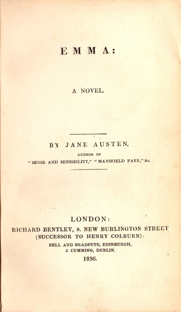 The first edition of Emma, the fourth novel to be published by Jane Austen, was published in 3 volumes in December 1815 by John Murray. Like all of the first editions of Austen it was not illustrated. It was the first Austen title published by John Murray, following some dissatisfaction with Thomas Egerton, who had published the first three Austen novels. The first edition of Emma was issued as 2000 copies, which all sold within one year of publication. Following Jane Austen’s death on 18th July 1817, John Murray resisted efforts by the Austen family, notably the author’s brother Henry and sister Cassandra, to publish a second edition of Emma.