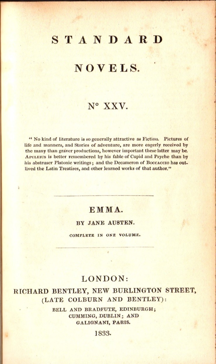 Emma, along with the other five novels of Jane Austen that had been published between 1811 and 1817, did not appear in a new English edition until Richard Bentley decided to reprint all of the Austen novels as “Standard Novels” in 1832. Emma was published by Richard Bentley on 27th February 1833, following his purchase of the Austen copyrights from Cassandra Austen via Henry Austen. Emma was numbered “XXV” (25 ) in the Standard Novel series. It was the second edition of Emma to be published in the UK, the first single volume edition, the first edition to have any illustrations and the first to have Jane Austen’s name as author on the title page(s). It was the second of Austen’s novels to be published by Bentley, following Sense and Sensibility (Gilson D1), which was published as Standard Novel number XXIII (23) on 28th December 1932, although it was dated 1833. Standard Novel XXIV (24) was a translation of Madame de Stael’s Corinne, which appeared on February 1st 1833.