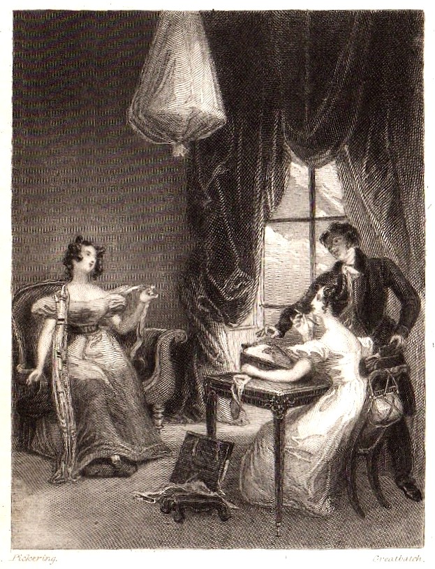 The two illustrations in this edition of Emma were drawn by Ferdinand Pickering (1810-1889) and engraved on wood by William Greatbatch (1802-1872). The identity of the artist had been uncertain for many years. The illustrations in Emma are clearly signed “Pickering”, which led David Gilson to suggest that they were by George Pickering (ca 1794-1857). However, other illustrations in the Standard Novel series that have many similarities of style to those in Emma are clearly signed “F. Pickering”, which has led to the corrected identification of Ferdinand Pickering as the artist. An enlarged version of the frontispiece is shown in Figure 2.