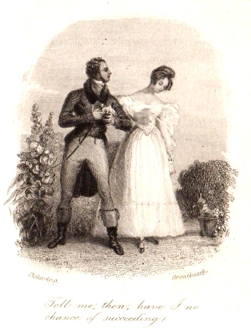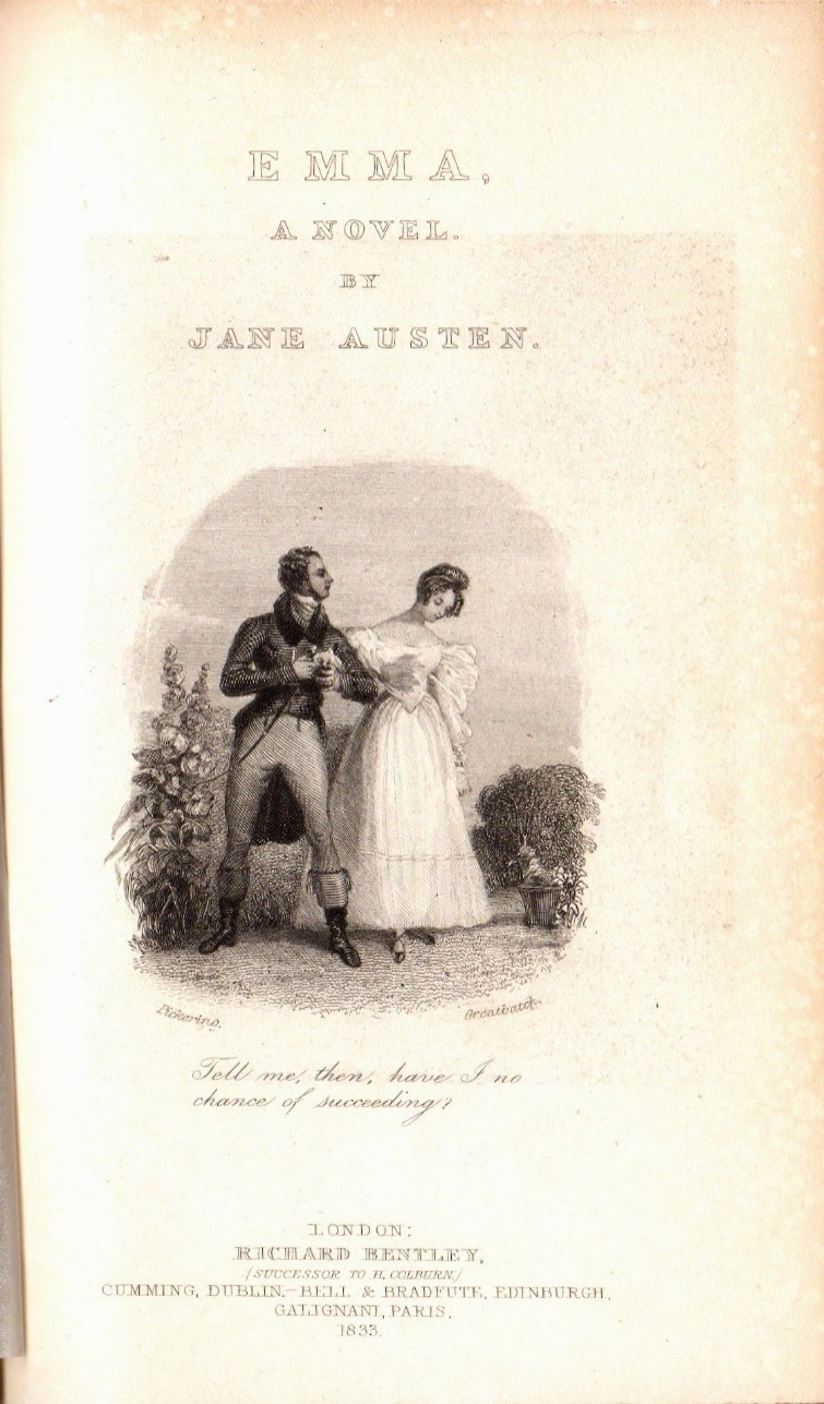 The engraved title page announces at the top that this is “EMMA. | A NOVEL. | BY | JANE AUSTEN.”. At the bottom of the page the publishers details are given thus: LONDON | RICHARD BENTLEY | (SUCESSOR TO H. COLBURN) | CUMMING, DUBLIN BELL & BRADFUTE, EDINBURGH | GALIGNANI, PARIS | 1833 . In the vignette, in the right hand panel, we see Emma out walking with Mr. Knightley, who has just declared his love for her. He then asks her “Tell me, then, have I no chance of succeeding?” which is the text below the image. This is taken directly from Chapter 49 of Emma. You can also see the names of Pickering and Greatbatch on the left and right lower corners of the image.