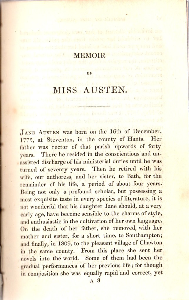 Immediately following the printed title page, Bentley presents a “Memoir of Miss Austen” which is on the preliminary pages (v) to (xiv), that is p5 to p14 in roman numerals. The memoir is unsigned and dated October 5th 1832. It has been described elsewhere as by “the Rev. Mr. Austen”, which would have been the author’s brother Henry Austen. The first part of the Memoir is an edited and revised version of the “Biographical Notice” published by Murray as a preface to the posthumous edition of Northanger Abbey/Persuasion in 1817, which is itself dated December 13th 1817. This was also generally agreed to have been written by Rev. Henry Austen. The second part of the Memoir, running from the bottom of page (x) to page (xiv), pages 10-14), are taken from a review of Northanger Abbey/Persuasion published in the Quarterly Review of January 24th 1821.