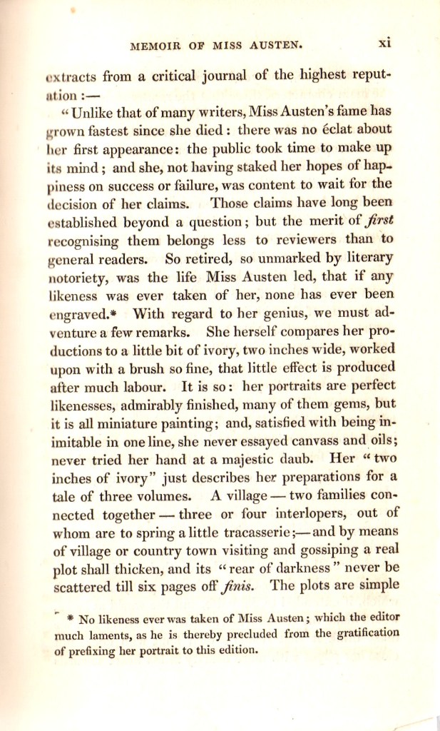 The final page of the “Memoir” is a note from the editor of Gilson D1, presumably Richard Bentley himself, which announces that the other novels of Jane Austen will follow in the Standard Novels series. The editor also comments on the importance of Jane Austen, cites the related novels of Madam D’Arblay (Fanny Burney), Miss (Maria) Edgeworth, Mrs. Opie and Miss Porter, and praises Jane Austen for “the truth, spirit, ease and refined humour of her conversations” , and her ability “to make the veriest every-day person a character of great interest.”