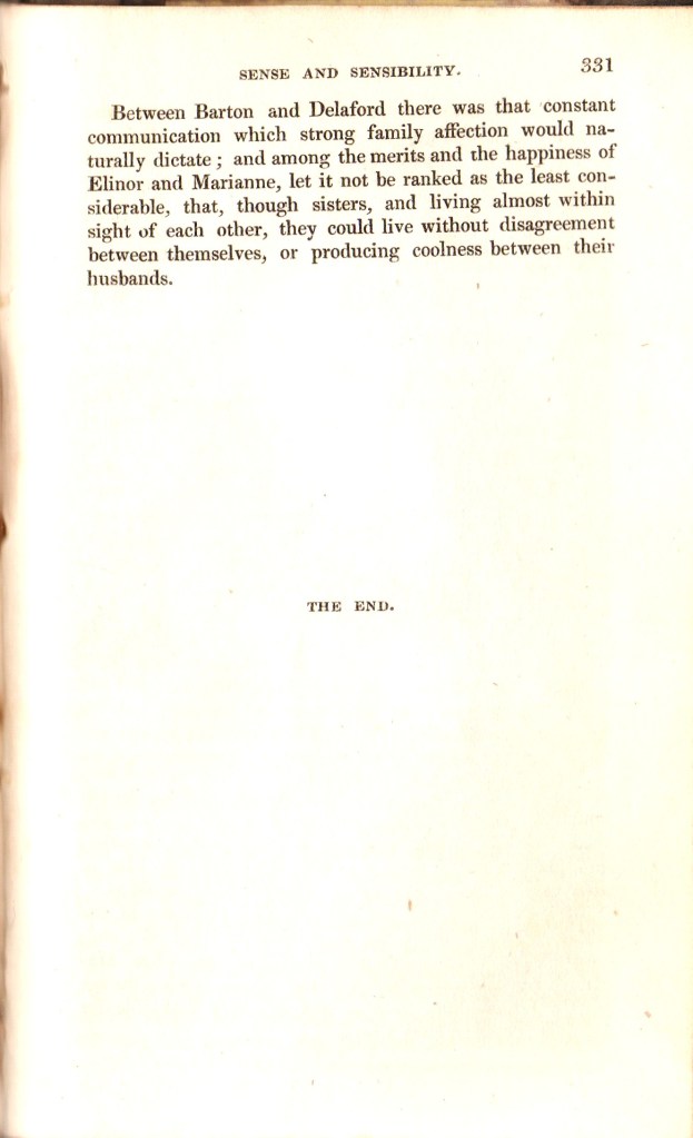 Richard Bentley arranged the text of Sense and Sensibility to correspond to the same chapter and volume arrangement as in the first and second editions. Accordingly, the book remains divided into 3 volumes, with Volume The First consisting of 22 chapters occupying pages 1-116; Volume the Second has 14 chapters running through pages 117-219 and Volume the Third also has 14 chapters running from page 220 to the final page 331. Throughout the book, most of the chapters do not start on a new page, and are separated by a simple centrally placed ruled line about half the width of the page. The chapters are numbered in large Roman numerals, whereas the page numbers are printed as Arabic numbers at the outer top corners of the pages. The first and last pages are shown in Figure 5 below.