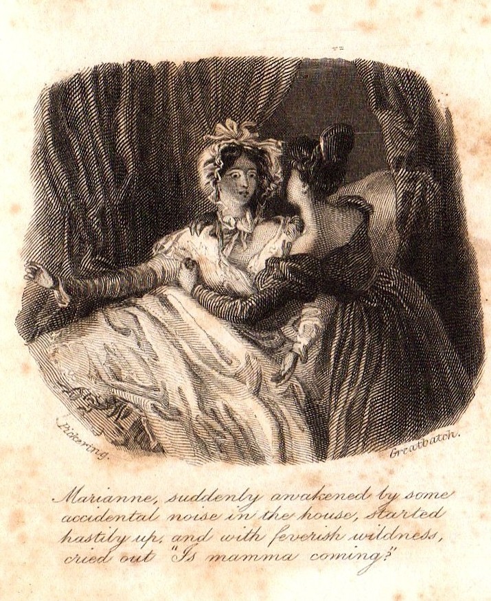 The vignette on the right of Figure 2 shows Marianne Dashwood suddenly awakening, startled and arising from her sickbed, held by her sister Elinor (from Volume 3, Chapter 7). The text reads: Marianne suddenly awakened by some accidental noise in the house, started hastily up, and with feverish wildness, cried out “Is mamma coming?”
