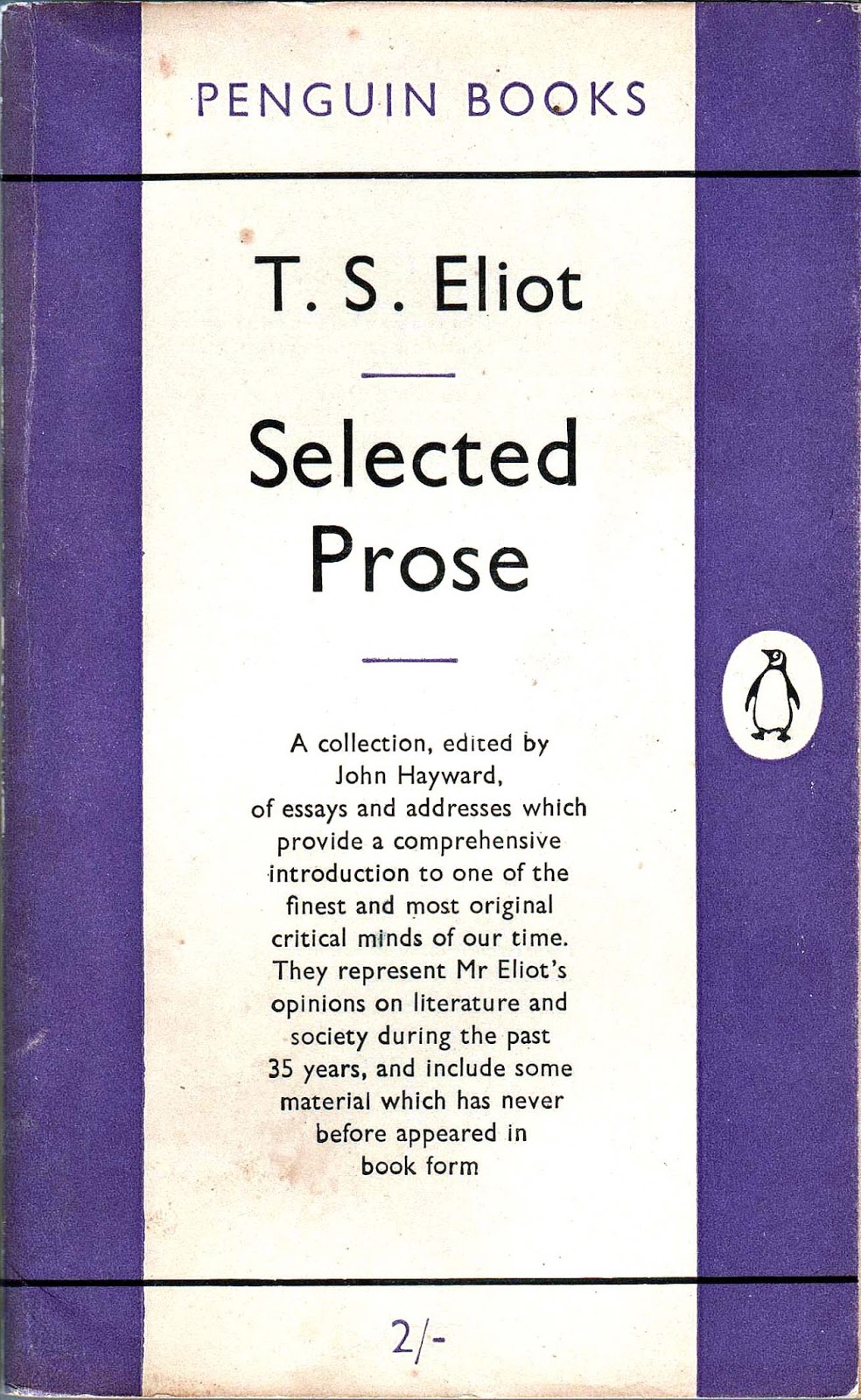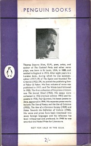 These are the front and rear covers of T S Eliot’s ‘Selected Prose’, which was published as Penguin 873 in March 1953. It is one of the earliest uses of the new vertical grid design that had been perfected by Schmoller. It is also an early appearance of the Penguin logo that had been redrawn by Tschichold, and was to be used for most of the next thirty years.