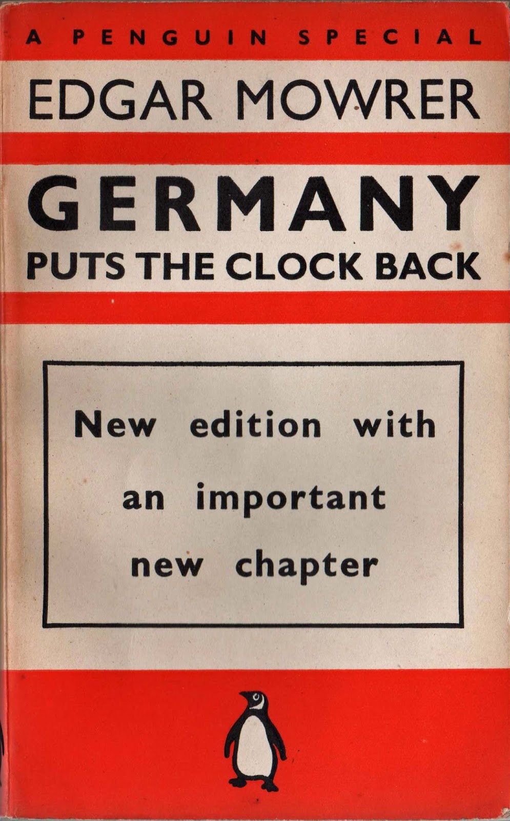Penguin Specials were the third major series to published by Penguin books, following the launch of the Penguin Main Series in July 1935 and Pelican books in May 1937. In November 1937, the publication of Penguin Special, S1, “Germany Turns Back the Clock” by Edgar Mowrer launched the Penguin Special series. These were books focused around current international political issues, and with the shadow of the approaching world war very evident to many people, they proved to be immensely popular.