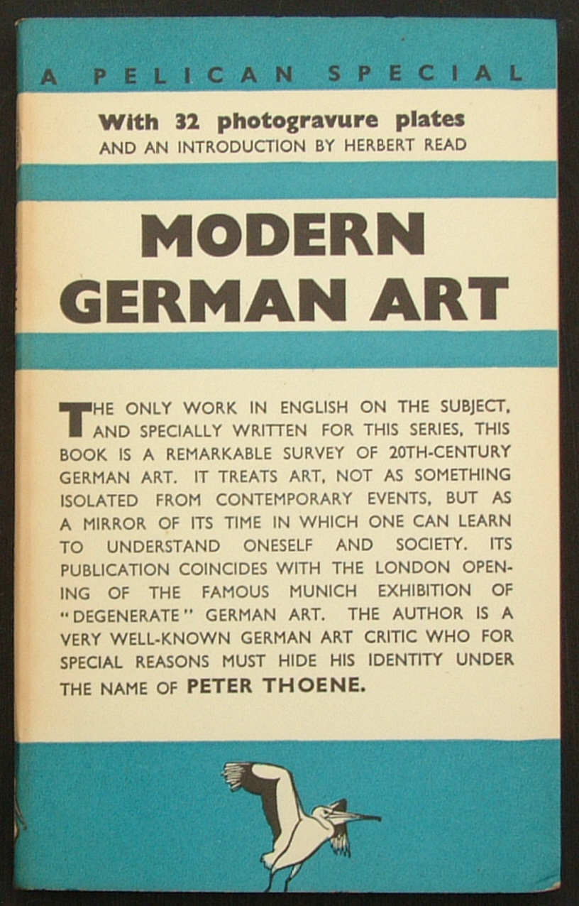 These were printed in a light blue livery, in the same banded style as the Penguin specials. Thus Penguin Specials S5 and S6 were Pelican Specials; S5 was “Ballet” by Arnold Haskel, which was illustrated with black and white photographs reproduced in photogravure and striking woodcuts by Kay Ambrose; and S6 was “Modern German Art” by ‘Peter Thoene’, a pseudonym to hide the true identity of the author, a German art critic, from the Nazis.