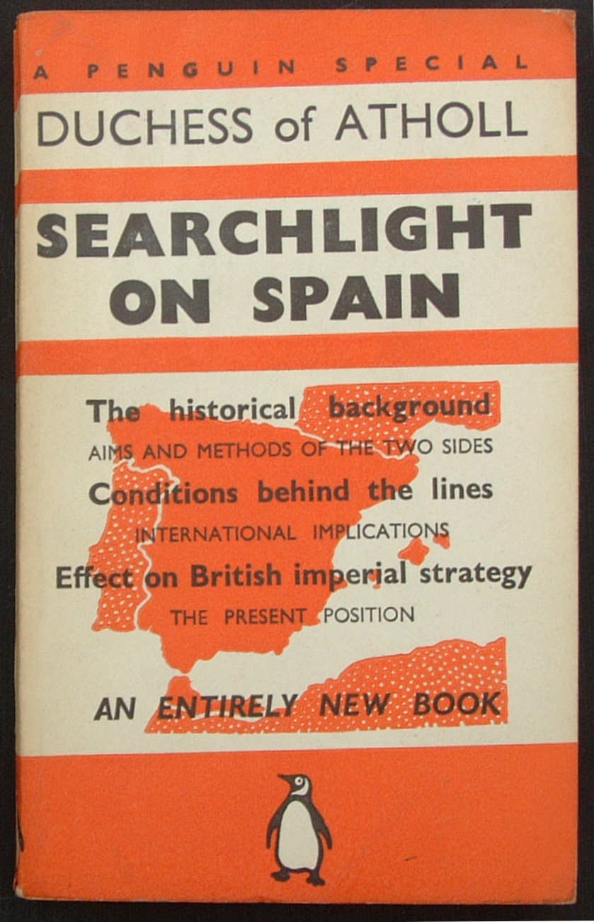 Penguin Special S4, “Searchlight on Spain” by the Duchess of Atholl, published in June 1938, with a second printing of 50,000 copies appearing one week later, had a dramatic orange map of the Iberian peninsula printed on the front cover.
